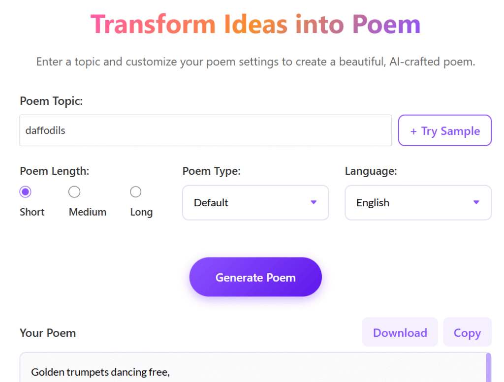Let your thoughts flow and let the tool handle the rhythm. Whether it’s a short verse or a heartfelt piece, our poem generator helps you create meaningful poetry in seconds no rhyming stress, no blank-page pressure.